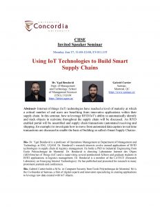 Bendavid Y. et Cartier G. (2020). Using IoT Technologies to Build Smart Supply Chains, Concordia Institute for Information Systems Engineering (CIISE), Université Concordia, Monday Jan 27, 11:00-12:00, EV011.119