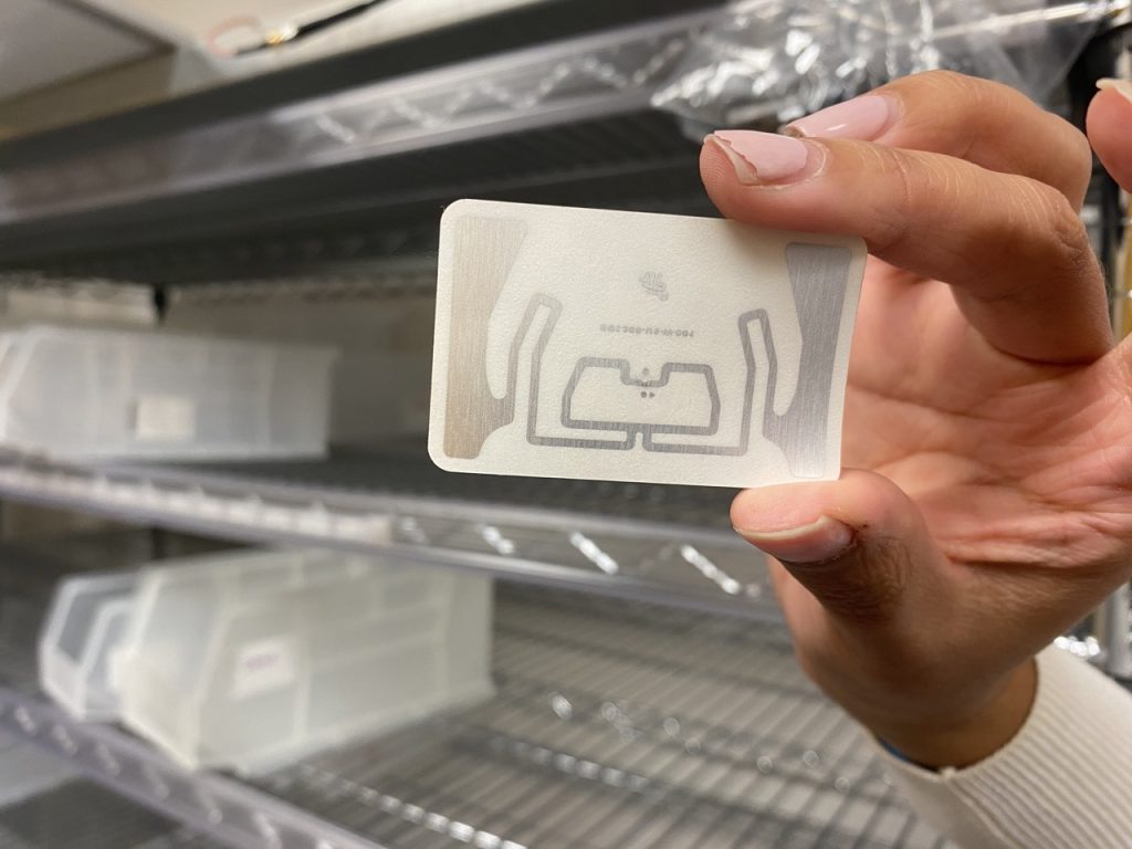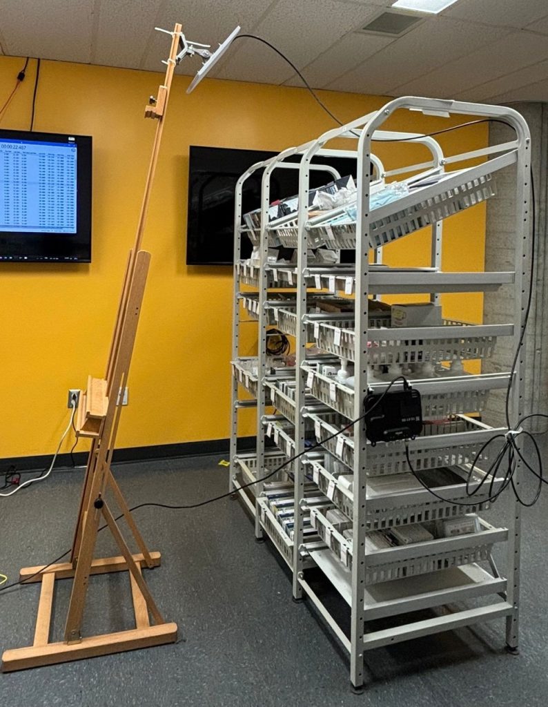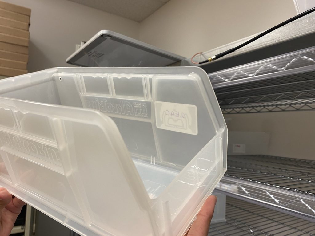 On test les lecteurs R700 de Impinj et diverses antennes de times-7 pour s’assurer de (a) détecter tous les bacs déposés sur l’étagère supérieure (b) ne détecter aucun autre bac. Les données sont ensuite envoyées à une plateforme logicielle pour être filtrées, entreposées et converties en informations utiles au processus de réapprovisionnement.