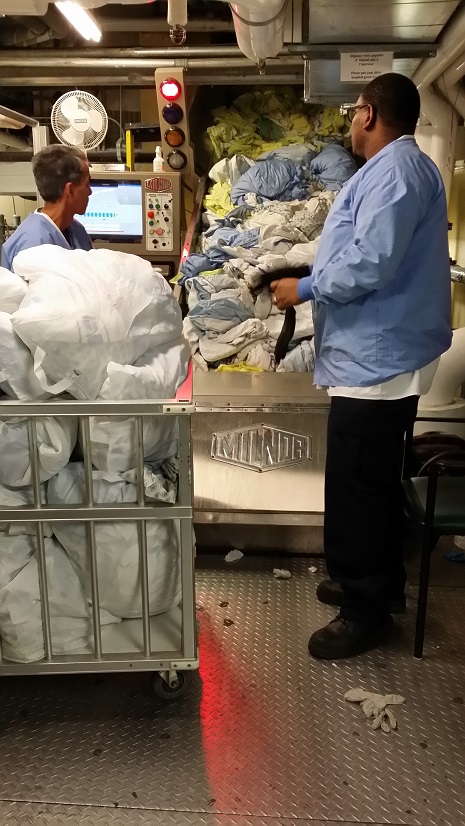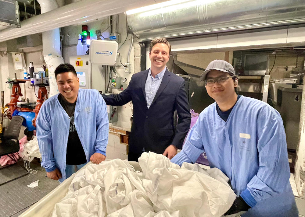 David Diachidos, Chief of Laundry and Linen Services, stands between Washman Mark De Leon (left) and Laundry Attendant Jervie Caunin at the entranceway where linen from the JGH arrives for laundering. Behind Mr. Diachidos is one of the three square antennas programmed to detect an incoming gel pack. A siren, next to the antenna, goes off if a pack is discovered