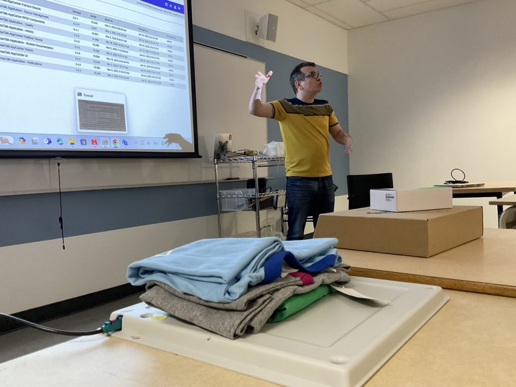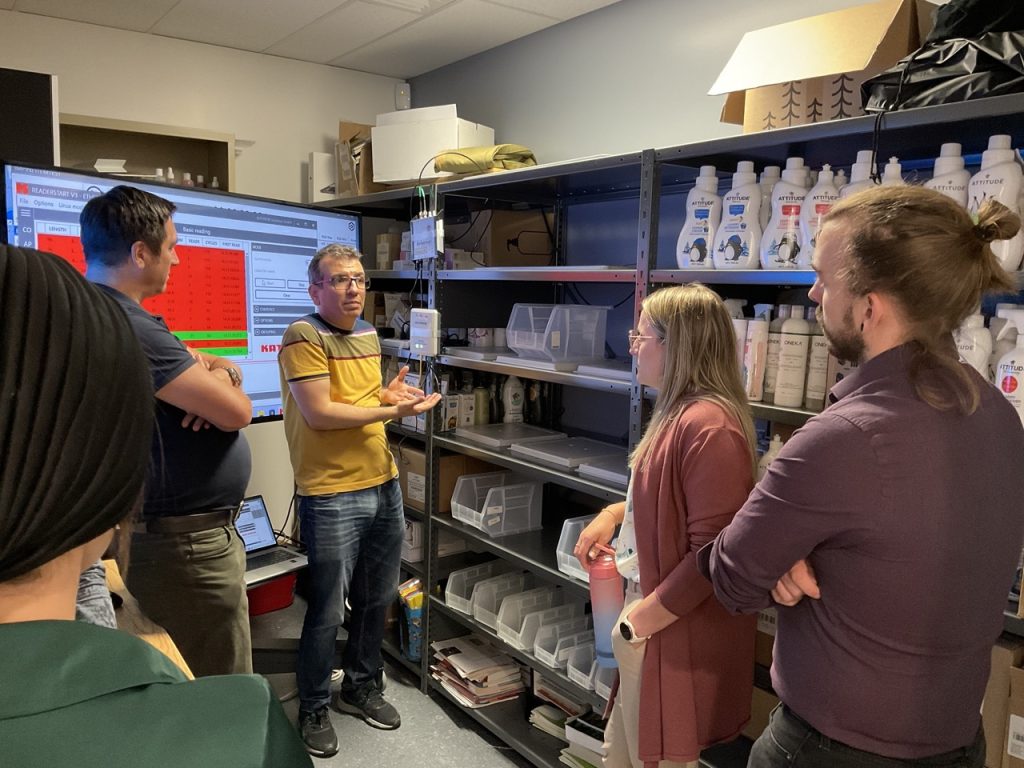 Visite de partenaires au lab. IoT pour une démonstration d’étagère connectée avec la technologie de Kathrein