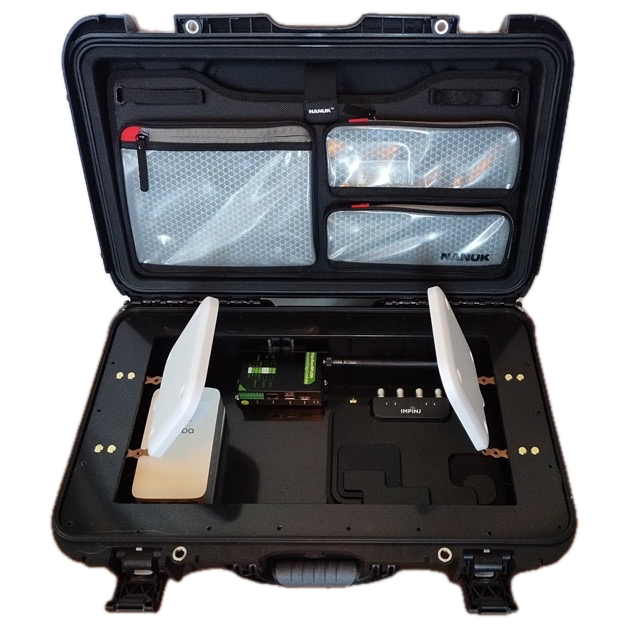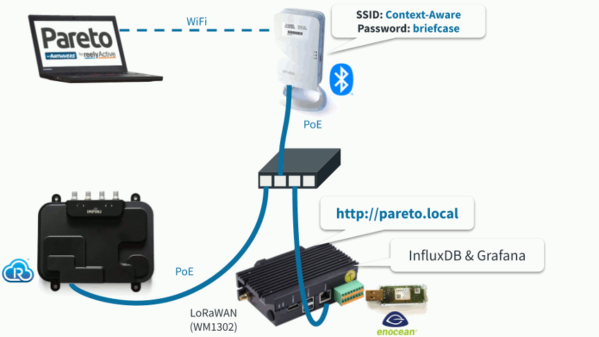 Infrastructure IoT de la valise (Un point d’accès BLE-WI-FI Aruba, un lecteur Impinj R700, un Raspberry Pi (EdgeBox RPI200) sur lequel est embarqué le logiciel open source Pareto Anywhere